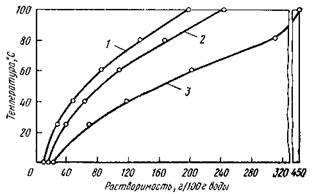 Рис. 2. Растворимость нитратов цезия (1), калия(2) и рубидия