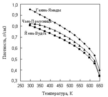 Из сопоставления следует, что все рассмотренные методы единообразно передают характер изменения плотности изобутилбензола с изменением температуры, наибольшее различие в оценках составляет 18% отн. и относится к 298 К. Причем метод Йена-Вудса дает меньшие значения плотности во всем диапазоне температур. Опыт нашей работы показывает, что из рассмотренных методов предпочтение следует отдавать методам Ганна-Ямады, Чью-Праусница и методу, основанному на коэффициентах сжимаемости, которые вычислены по таблицам Ли-Кеслера или аналитическому уравнению состояния Бенедикта-Уэбба-Рубина.