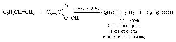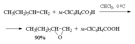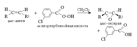 В настоящее время для эпоксидирования чаще всего используют м -хлорпербензойную кислоту. В отличие от других перкислот она стабильна при хранении в течение длительного времени (до 1 года) и абсолютно безопасна при обращении. Выходы оксиранов, полученных при окислении ациклических и циклических алкенов м -хлорпербензойной кислотой в растворе хлористого метилена, хлороформа или диоксана, обычно довольно высоки[11] .