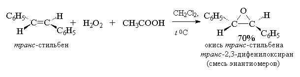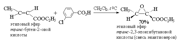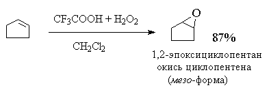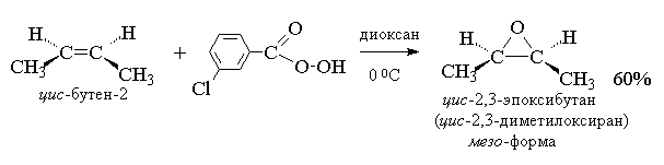Т. к. атака двойной связи атомом кислорода надкислоты равновероятна с обеих сторон плоскости двойной связи, образующиеся оксираны представляют собой либо мезо -формы, либо смеси энантиомеров. В качестве эпоксидирующих агентов используются следующие перкислоты: пербензойная, м -хлорпербензойная, моноперфталевая, перуксусная, трифторперуксусная и пермуравьиная. Перкислоты ароматического ряда применяют в виде индивидуальных реагентов, тогда как перкислоты алифатического ряда - СН3 СО3 Н, CF3 CO3 H и НСО3 Н не выделяют в индивидуальном виде, а используют после их образования при взаимодействии 30% или 90%-ного пероксида водорода и соответствующей карбоновой кислоты. Пербензойную и м -хлорпербензойную кислоты получают окислением соответственно бензойной и м -хлорбензойной кислот 70%-ной перекисью водорода в растворе метансульфокислоты или из хлорангидридов этих кислот и перекиси водорода.