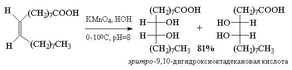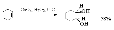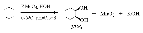 Некоторые соли и оксиды переходных металлов в высших степенях окисления являются эффективными реагентами син -гидроксилирования двойной связи алкена, когда обе гидроксильные группы присоединяются с одной и той же стороны двойной связи. Окисление алкенов перманганатом калия - один из старейших методов син -гидроксилирования двойной связи - продолжает широко использоваться, несмотря на свойственные ему ограничения. Цис -1,2-циклогександиол был впервые получен В.В. Марковниковым в 1878 году гидроксилированием циклогексена водным раствором перманганата калия при 0 0 С.