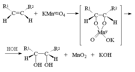 Первоначально при окислении алкенов перманганатом калия образуется циклический эфир марганцевой кислоты, который немедленно гидролизуется до вицинального диола.