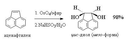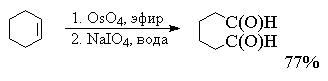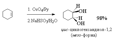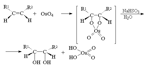 Другой метод син -гидроксилирования алкенов под действием оксида осмия (VIII) OsO4 был предложен Р. Криге в 1936 году. Тетраоксид осмия представляет собой бесцветное, летучее, кристаллическое вещество, хорошо растворимое в эфире, диоксане, пиридине и др. органических растворителях. При взаимодействии тетраоксида осмия с алкенами в эфире или диоксане образуется черный осадок циклического эфира осмиевой кислоты - осмат, который легко может быть изолирован в индивидуальном виде. Присоединение OsO4 к двойной связи заметно ускоряется в растворе в пиридине. Разложение осматов до вицинальных гликолей достигается действием водного раствора гидросульфита натрия или сероводородом.