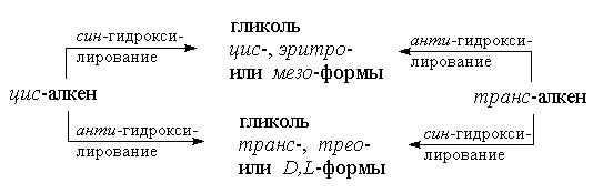 В заключение можно привести стереохимические отношения между алкеном цис - или транс -конфигурации и конфигурацией образующегося вицинального диола, который может быть цис - или транс -изомером, эритро - или трео -формой, мезо - или D,L -формой в зависимости от заместителей в алкене[20] :