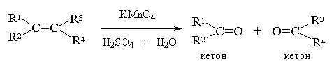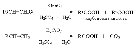 При окислении алкенов щелочным водным раствором перманганата калия при нагревании или раствором KMnO4 в водной серной кислоте, а также при окислении алкенов раствором оксида хрома (VI) CrO3 в уксусной кислоте или дихроматом калия и серной кислотой первоначально образующийся гликоль подвергается окислительной деструкции. Конечным результатом является расщепление углеродного скелета по месту двойной связи и образование в качестве конечных продуктов кетонов и (или) карбоновых кислот в зависимости от заместителей при двойной связи. Если оба атома углерода при двойной связи содержат только по одной алкильной группе, конечным продуктом исчерпывающего окисления будет смесь карбоновых кислот, тетразамещенный при двойной связи алкен окисляется до двух кетонов. Однозамещанные алкены с концевой двойной связью расщепляются до карбоновой кислоты и углекислого газа[21] .