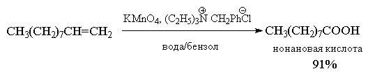 Из-за невысоких выходов карбоновых кислот и кетонов, реакции исчерпывающего окисления алкенов в классическом варианте не нашли широкого применения и ранее использовались, в основном, для установления строения исходного алкена по продуктам деструктивного окисления. В настоящее время окисление алкенов (R-CH=CH-R и R-CH=CH2 ) до карбоновых кислот (RCOOH) с помощью перманганата или дихромата калия проводят в условиях межфазного катализа. Выходы карбоновых кислот при этом превышают 90%.