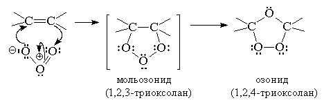 С. Окончание реакции контролируется пробой на свободный озон с иодидом калия. Механизм этой своеобразной и сложной реакции установлен главным образом благодаря работам Криге. Первым продуктом 1,3-диполярного циклоприсоединения к двойной связи является так называемый мольозонид (1,2,3-триоксолан). Этот продукт нестабилен и далее самопроизвольно разлагается с раскрытием цикла и образованием в качестве конечного продукта нормального озонида (1,2,4-триоксолана)[23]