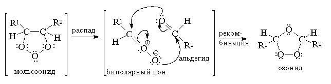 В настоящее время общепризнано, что превращение мольозонида в обычный озонид происходит по механизму расщепления - рекомбинации. Мольозонид претерпевает самопроизвольное раскрытие нестабильного 1,2,3-триоксоланового цикла с образованием карбонильного соединения и биполярного иона, которые далее реагируют между собой также по схеме 1,3-диполярного циклоприсоединения.
