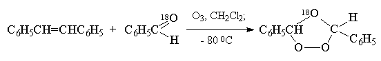 Приведенная схема перегруппировки мольозонида в нормальный озонид подтверждается тем, что если до полного образования озонида в реакционной смеси присутствует в качестве "перехватчика" биполярного иона другое карбонильное соединение, то образуется так называемый "смешанный озонид". Так, например, при озонилизе цис -стильбена в присутствии бензальдегида, меченного изотопом 18 О, метка входит в состав эфирного, а не перекисного мостика озонида:
