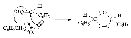Этот результат хорошо согласуется с образованием смешанного озонида при рекомбинации биполярного иона с меченным бензальдегидом: