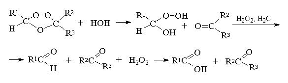 Озониды представляют собой очень нестабильные соединения, разлагающиеся со взрывом. Их не выделяют в индивидуальном виде, а расщепляют при действии самых разнообразных регентов. Следует различать восстановительное и окислительное расщепление. При гидролизе озониды медленно расщепляются на карбонильные соединения и перекись водорода. Перекись водорода окисляет альдегиды до карбоновых кислот. Это так называемое окислительное разложение озонидов: