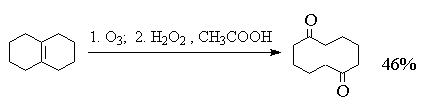 Таким образом, при окислительном разложении озонидов образуются карбоновые кислоты и (или) кетоны в зависимости от строения исходного алкена. В качестве окислителей можно использовать кислород воздуха, перекись водорода, перкислоты или гидроокись серебра. Наиболее часто в синтетической практике для этой цели используют перекись водорода в уксусной или муравьиной кислоте, а также перекись водорода в щелочной среде.