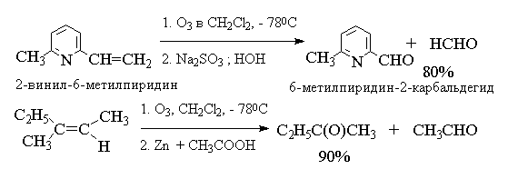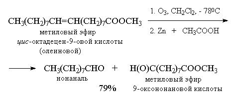 Реакция алкенов с озоном является наиболее важным методом окислительного расщепления алкенов по двойной связи. В течение многих десятилетий эта реакция служила основным методом определения строения исходного углеводорода, а также находила применение в синтезе разнообразных карбонильных соединений. Реакция алкена с озоном проводится пропусканием тока ~5%-ной смеси озона и кислорода в раствор алкена в хлористом метилене или этилацетате при -800