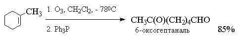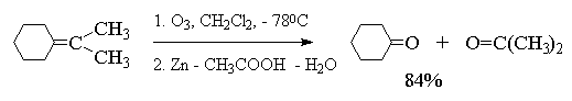 Из приведенных выше примеров видно, что тетразамещенный при двойной связи алкен при озонолизе и последующем восстановительном разложении озонида образует два кетона, тогда как тризамещенный алкен дает кетон и альдегид. Дизамещенный симметричный алкен при озонолизе образует два альдегида, а алкены с концевой связью - альдегид и формальдегид.