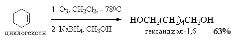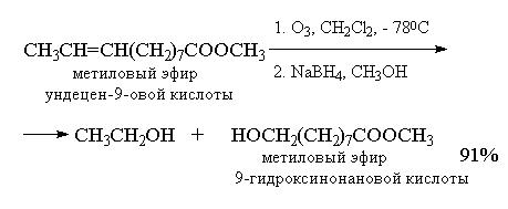 Интересной модификацией озонолиза является метод, где в качестве восстановителя озонида используется боргидрид натрия, В этом случае конечными продуктами реакции оказываются первичные или вторичные спирты, образующиеся при восстановлении соответственно альдегидов и кстонов[26] .