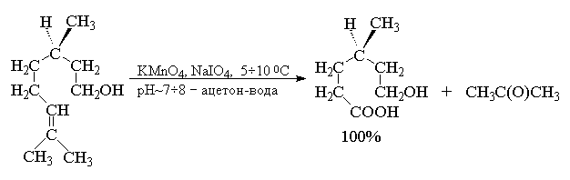 Цитронеллол - спирт, входящий в состав розового масла, масла герани и лимона, - окисляется смесью перманганата калия и периодата натрия в водном ацетоне при 5
