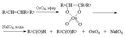 В терминах, характерных для современной органической химии, это означает, что комбинация OsO4 -NaIO4 представляет собой синтетический эквивалент реакции озонолиза алкенов с последующим восстановительным расщеплением. Аналогично, окисление алкенов смесью перманганата и периодата - это синтетический эквивалент озонолиза с окислительным разложением озонидов.