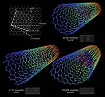 Углеродные нанотрубки (тубулены ) — это протяжённые цилиндрические структуры диаметром от одного до нескольких десятков нанометров и длиной до нескольких сантиметров , состоящие из одной или нескольких свёрнутых в трубку гексагональных графитовых плоскостей и заканчивающиеся обычно полусферической головкой, которая может рассматриваться как половина молекулы фуллерена