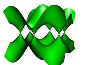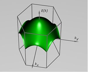 Спектр углеродной плоскости в первой зоне Бриллюэна. Показана только часть E(k)>0 , часть E(k)<0 получается отражением в плоскости kx , ky .