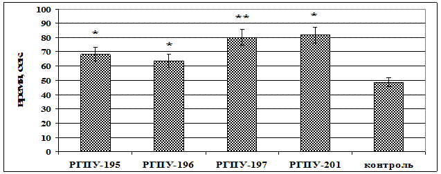 Рис.5. Влияние соединений на физическую работоспособность в «тесте принудительного плавания с грузом», вес которого составляет 20% от массы тела животного.