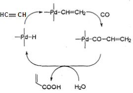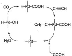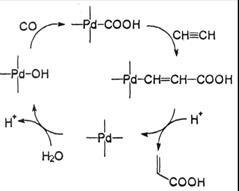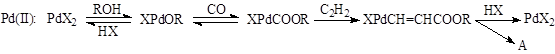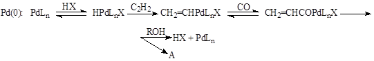 Гипотезы о состоянии катализатора, о механизмах формирования активных центров из предшественников и о природе активного центра чрезвычайно важны для перехода к гипотезам следующего уровня – к элементарным стадиям (ЭС) и реакционным сетям (РС). Рассмотрим два характерных примера из области металлокомплексного катализа. В реакциях, катализируемых комплексами Pd из предшественников PdX2 и PR3 могут сформироваться в зависимости от реагентов и среды комплексы Pd(II) – PdX2 (PR3 )2 , Pd(0) – Pd(PR3 )n и Pd(I) – Pd2 X2 (PR3 )2 . Очевидно, что палладий в разных степенях окисления будет способен участвовать в разных по природе стадиях механизма. Например, Pd(II) – окислитель, акцептор пар электронов, мягкая апротонная кислота, а Pd(0) – восстановитель, донор пар электронов, мягкое основание. Так, механизмы одной и той же реакции алкоксикарбонилирования ацетилена с образованием акрилата (А) на этих двух частицах в спиртовых растворах принципиально различны:
