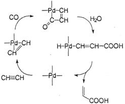 В первом случае вначале активируется спирт (SE ), а затем СО и С2 Н2 , во втором – реакция начинается с окислительного присоединения HX, затем в реакцию вступают ацетилен, СО и ROH. Таким образом, выбор возможных стадий и схем механизма прежде всего определяется свойствами металлокомплекса в растворе или свойствами активного центра на поверхности.