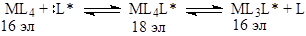 Таким образом, в стадиях с участием d -металлов, которые рассматриваются как элементарные, число валентных электронов должно меняться на 2 единицы (18®16®18 и т.д.). Комплексы, имеющие в валентной оболочке 16 электронов, естественно, более реакционноспособны в реакциях замещения лигандов, поскольку в этом случае возможен ассоциативный механизм замещения: