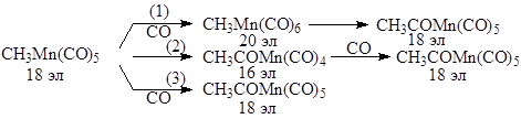 Из трех вариантов механизма внедрения молекулы СО по связи СН3 –Mn вариант (1) согласно правилу Толмена наименее вероятен: