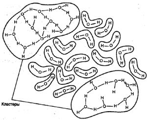 Некоторые ученые предлагают рассматривать воду как совокупность ассоциаций молекул, включая при этом в каждую ассоциацию от одной до восьми молекул. Другие считают, что структура воды представляет собой пространственное «кружево», образованное различными «мерцающими кластерами» (рис.2). Третьи предлагают исследовать свойства воды с учетом особенностей строения ее молекулы, которые, в свою очередь, определяются особенностями составляющих молекулу воды элементов. В соответствии с современными представлениями, молекула воды похожа на маленький магнит.