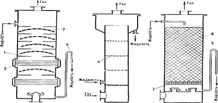 а — абсорбер с пассетами; б — абсорбер с секционированием сит-чатыми тарелками; в — абсорбер с насадкой (эмульгационная колонна); 1 — днище пассета; 2— дырчатый колпак; 3— холодильный элемент; 4 — перфорированные перегородки (ситчатые тарелки); 5 — утка; б — насадка; 7 — решетка.