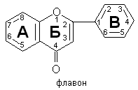 Флавоноидами называется группа фенольных соединений с двумя ароматическими кольцами, объединенных общим структурным составом С6-С3-С6. Первое бензольное кольцо, конденсированное в большинстве классов с кислородосодержащим гетероциклом С или непосредственно прилежащее к карбонильной группе пропанового фрагмента, как в халконах, обозначают буквой А, а боковой фенильный заместитель - буквой В латинского алфавита. Исходя из такого обозначения, порядок нумерации в гетероциклических флавоноидах начинается с гетероатома с переходом на кольцо А, а в кольце В порядок нумерации автономный и начинается с углерода, связанного с остальной частью молекулы [3].
