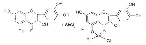 5-оксифлавоны и 5-оксифлавонолы, взаимодействуя с треххлористой сурьмой, образуют комплексные соединения, окрашенные в желтый или желто-оранжевый цвет - флавоны, в красный или красно-фиолетовый - халконы.