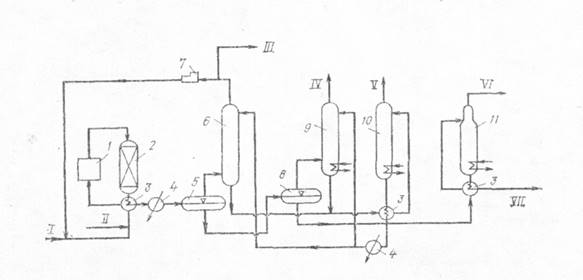 I — свежий водородсодержащий газ; II — сырье; III— отдув (водородсодержащий газ); IV — углеводородный газ; V — сероводород; VI — бензин; VII — дизельное топливо гидроочищенное
