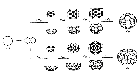 В работе [27] исследовался продукт пиролиза нафталина С10 Н6 в кремниевой трубе, нагретой с помощью пропановой горелки до Т»1300К. В продукте пиролиза содержался ~1% C60 и все промежуточные кластеры образования С60 из С10 –двойное ароматическое кольцо.