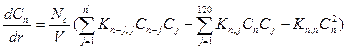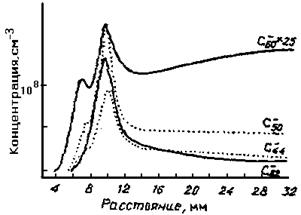 Расстояние, мм рис.23. Зависимость концентрации отрицательных заряженных кластерных ионов углерода от расстояния от края горелки в пламени бензола |