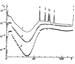 Производился оммический нагрев графитового стержня в гелии р=100 торр. Углеродный конденсат собирался на стеклянный диск. Чёрная пудра затем соскабливалась с диска в воздухе, закладывалась в небольшую ячейку из нержавеющей стали с соплом диаметром 2 мм. Ячейка помещалась в камеру с давлением 10-5 торр и нагревалась. При Т=500-600 0 С из сопла истекали частички, которые собирались на тонкую вольфрамовую ленту и образовывали слой в несколько мкм. Масс-спектр этих частичек исследовался с помощью поверхностного испарения KrF лазером 60 мкДж. Это вызывало десорбцию с поверхности ленты. Затем производилась ионизация Ar-F-лазером 200 мкДж и масс-спектрометрия. В качестве буферного газа использовался аргон. Фуллерены могли образовываться как при термическом испарении в гелии, так и при лазерном испарении слоя сажи на вольфрамовой ленте в аргоне.