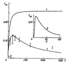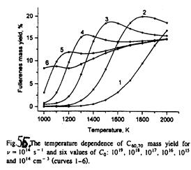 Рис. 8. Зависимость “выходов фуллеренов” от температуры газа (гелия) на входе струи. N0 =1017 cm3 ,V0 =4*103 cm/s. |