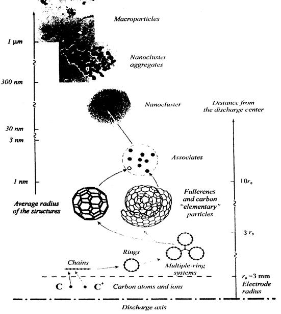 вдалеке от дуги, а лучше вне реактора. Наиболее оптимальной температурой трансформации кольцевых кластеров в фуллерены в [10,11] считается Te »0.25эв. |