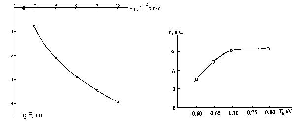 | Рис. 7. Зависимость “выхода фуллеренов “от начальной скорости.T=0.7eV,N0 =1017 cm-3 . |