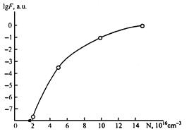 | Рис.9. Зависимость “выхода фуллеренов” от концентрации углерода на входе струи T=0.7eV, V0 =4*103 cm/s, m/t=1.5*10-3 г/с |