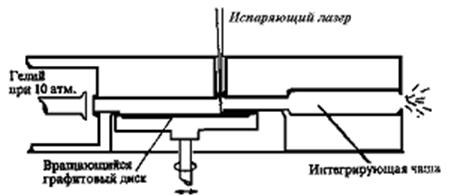 Схема эксперимента показана на рис.10. Гелий подавался импульсами на время »10-3 с. Лазер включался в середине времени истока гелия l=532 нм, t=5нс, 30-40 мДж. Испаряющий материал захватывается потоком гелия, смешивается и охлаждается и затем конденсируется в кластеры. Степень кластеризации могла варьироваться изменением давления газа, моментом включения лазерного импульса, а также длиной и геометрией канала. Иногда в конце канала устанавливалась интегрирующая чаша, увеличивающая время кластеризации перед началом сверхзвукового расширения. Затем часть потока отбиралась в масс-спектрометр (ионизация Ar-F лазер 193нм). Пик С60 становится более заметным, когда большее время остаётся для высокотемпературных (при комнатной температуре и выше) столкновений между кластерами. При повышенном давлении гелия вблизи С60 появляются заметные пики кластеров от С30 до С60 , а сам пик С60 менее заметен. Общее содержание фуллеренов мало и достаточно только для надёжной регистрации. Здесь мало количества испаряемого графита и происходит его слишком быстрое охлаждение потоком холодного газа.