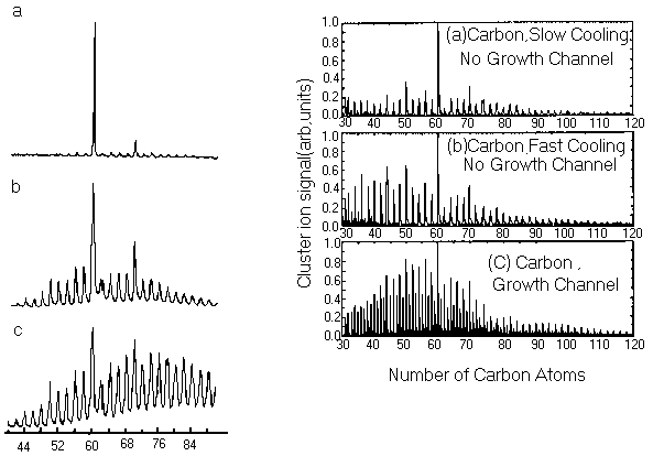 Fig.3. Carbon positive cluster-ion signal for (a) exfoliated graphite (Grafoil) vaporized directly into a low-density helium expansion, (b) Grafoil vaporized into a high-density helium expansion, and (c) Graphoil vaporized into a growth channel. |