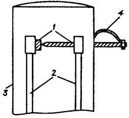 | Рис.11. Схема установки по производству С60 в граммовых количествах [19] 1- графитовые электроды; 2-охлаждаемая водой медная шина; 3- охлаждаемая водой поверхность, на которой осаждается угольный конденсат ; 4-пружины. |