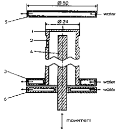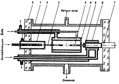 Рис.19. Конструкция экспериментального макета,1-графитовый стакан, 2-тепловой мостик, 3-водоохлаждаемый токоввод, 4-графитовый стержень, 5-водоохлаждаемый сборник сажи, 6-водоохлаждаемый экран |