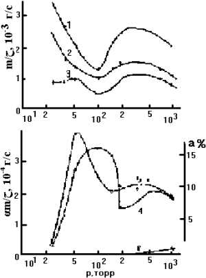 Рис 14. Результаты оптимизации фуллереновой дуги по межэлектродному расстоянию. Phe=100тор,I=81-86A,1-∆ma /t, 2-mc /c, 3-mk /t, 4-α. |