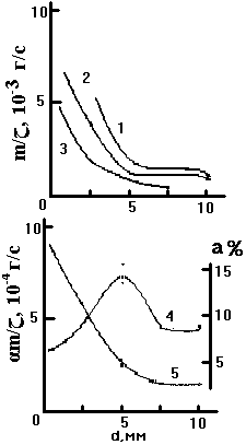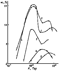 Рис.15. Зависимость содержания фуллеренов в саже α от давления газа при различных диаметров сборника фуллереновой сажи Dс . 1-3-гелий, 4-неон, 5-аргон; Dc (в мм) 1,4,5-96, 2-52, 3-30 ; I,А : 1-3-80, 4-210, 5-200. |