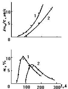 Рис.16. Зависимость скорости эрозии анода ∆ma /ح и содержание фуллеренов в сажи α от тока дуги при различных диаметрах анода Phe=100 торр, Dc =96мм, d=5 мм, Da (в мм ): 1-6, 2-20 |