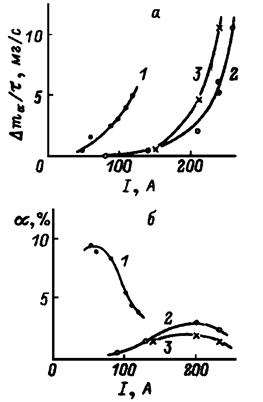 | Рис.17. Зависимость скорости эрозии анода ∆ma /t (a) и содержания фуллеренов в саже a (б) от тока дуги. Dc =96 мм,d=5мм,Da =6мм;1-гелий,РHe =400 торр;2-неон РNe =500 торр,3-аргон,РAr =400 торр. |