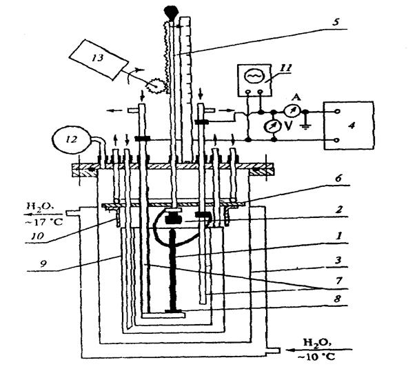 Рис.20. Установка для получения фуллереносодержащей сажи: 1-испаряемый графитовый электрод; 2-неиспаряемый графитовый электрод (катод) ; 3-основная ёмкость; 4-источник питания дуги; 5-стержень из нержавеющей стали; 6-охлаждаемый медный экран; 7-токовводы; 8-графитовое кольцо; 9-дополнительный охлаждаемый сосуд; 10-дополнительный медный экран: 11-осциллограф; 12-вакуумметр; 13-двигатель РД-09.