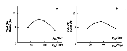 Рис.21. Зависимость выхода фуллеренов от давления гелия :a- постоянный ток, b-переменный ток |